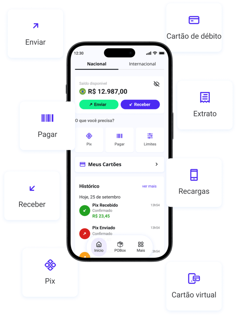 Tanto o cartão nacional quanto o internacional são pré-pagos e funcionam como crédito, mas sem fatura ou mensalidade. Eles estão vinculados ao saldo da sua carteira: o cartão nacional à carteira nacional e o internacional à carteira internacional.